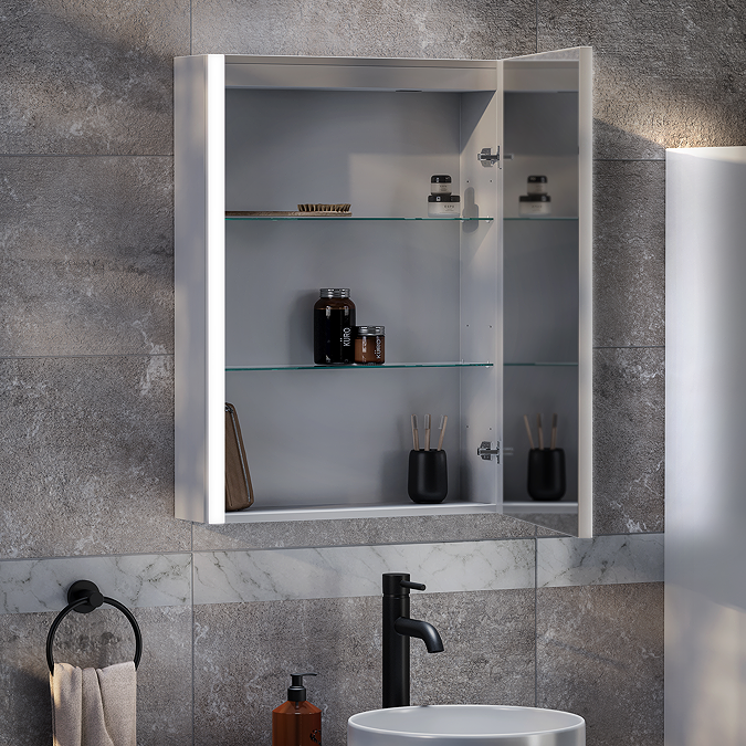Arezzo 500 x 700mm LED Illuminated Bathroom Mirror Cabinet with Anti-Fog Demist, Dimmer, Touch Sensor and Shaver Socket